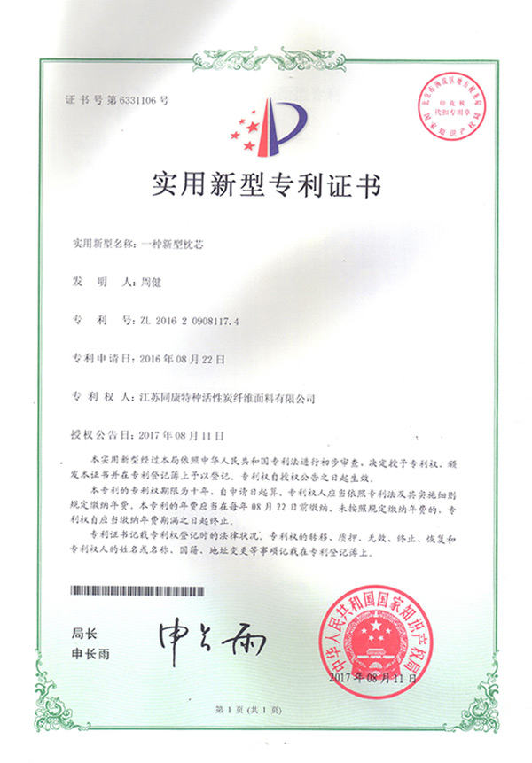 專利證書一種新型枕芯