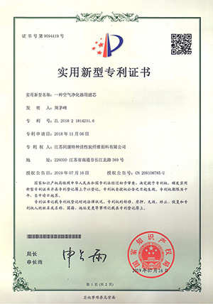 專利證書一種空氣凈氣器濾芯