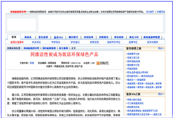 海南旅游超市網(wǎng)、天府熱線網(wǎng)——同康活性碳成為飯店環(huán)保綠色產(chǎn)品
