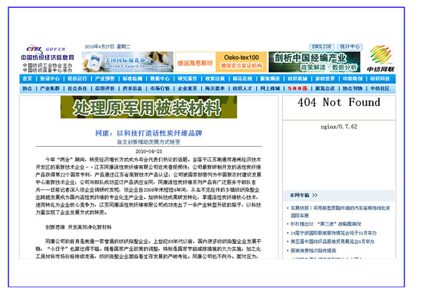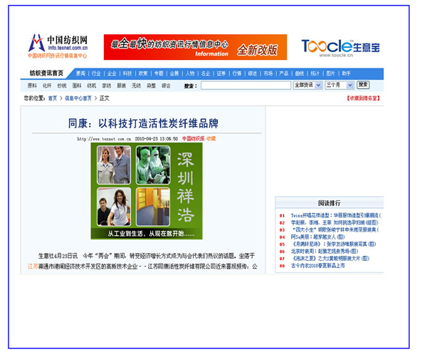 中國紡織經濟信息網、中國紡織網——同康:以科技打造活性碳纖維品牌